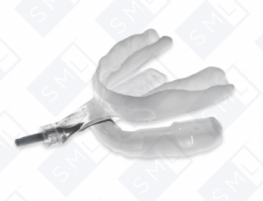 A simple treatment for snoring and sleep apnea, the myTAP holds the lower jaw in place so that the soft throat tissue does not collapse into the airway.  The myTAP adjustment mechanism is attached to the lower tray and is threaded through the adjustment post of the upper tray.