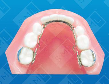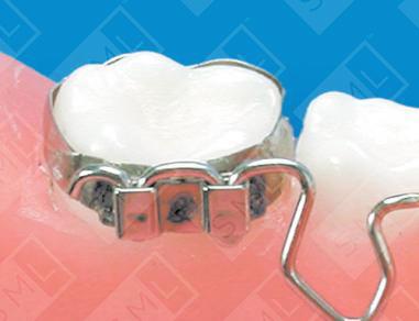 This lingual arch features lingual lap springs to align the incisors and adjustment loops to move them labially to regain lost cuspid space. The lingual arch wire is attached to the bands with Wilson Vertical Attachments. This allows you to remove the arch wire, as well as easily adjust the lap springs and adjustment loops out of the patient’s mouth. Regular adjustments of the loops will continue to move the anteriors labially. Note : Make sure to protect the attachments from cement by placing wax in them prior to cementation.