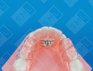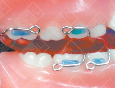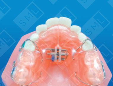 This appliance uses the standard Twin Block approach for treatment mechanics. Clasping is, however, quite unique. Composite ledges (blue acrylic) create undercuts that provide superior retention for circumferential clasps. This technique is particularly useful when the teeth that are used for retention have short clinical crowns. If desired, the free end of the circumferential clasps can be finished in a loop, making it easy for the patient to remove the appliances for cleaning.