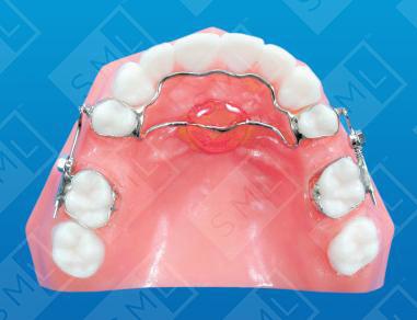 This popular molar distalizer can be used on either arch and can also be used in a unilateral or bilateral configuration. The anterior portion typically attaches to the first bicuspid bands with a Nance Button -- and often with an additional lingual wire for anchorage. Vertical tubes on the buccal aspect of these bicuspid bands accept the .032 guide wires that run back through the horizontal tubes on the molar bands. Gurin Locks and open coil springs are placed to provide the necessary distalizing force to the molars.