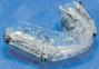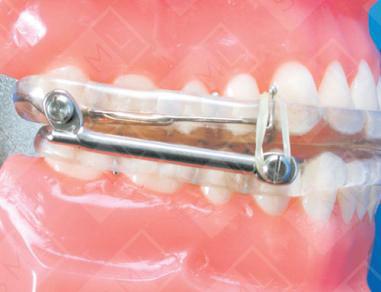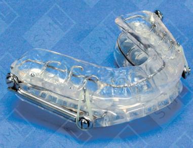 This appliance consists of two occlusal splints held together by a bilateral Herbst tube assembly. This set-up allows the mandible to positively be postured forward. Posturing the mandible forward brings the tongue anteriorly to open up the airway. This unique design allows the mandible to move freely in both a vertical and a lateral direction while at the same time preventing the mandible from dropping back during sleep. Because the Herbst tubes are placed buccally to the teeth, there is nothing to interfere with the patient’s tongue position and patients find this design extremely comfortable. Users of this appliance typically provide a construction bite taken with the mandible positioned 75% of the way from maximum intercuspation to maximum protrusive with a 4mm vertical opening in the anteriors. This appliance can also be titrated forward from its initial position by adding shims in 1mm, 2mm, and 3mm increments. The occlusal surfaces of the upper and lower portions of this appliance are carefully milled into full contact. Vertical elastics are used in the cuspid region to create a proprioceptive response that encourages a lip together posture. Maximum retention is achieved through multiple ball clasps on both the upper and the lower portions of the appliance.