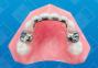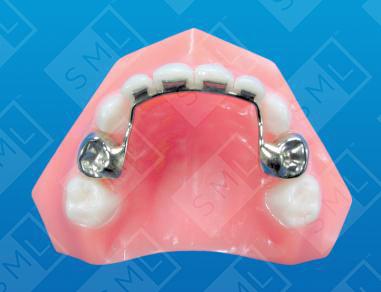 This appliance is the same as #4310, but utilizes stainless steel crowns in place of molar bands. The Groper Fixed Anterior Bridge - with crowns U/L is often used when the abutment teeth are partially compromised or when superior strength of the overall appliance is desired. Additional stability can be achieved by adding rests to the lingual wire and then bonding them to the lingual surface of the primary cuspids or first primary molars. This is particularly useful for patients who tend to be tough on their appliances. IMPORTANT: When taking an impression for this appliance, it is best to do so with the crowns in place. Pour the impression with the crowns firmly seated in the impression, Then check the poured-up model for accuracy before sending to the lab. Note: As with all bridges and partials, opposing models and a bite registration are necessary to ensure proper construction.
