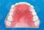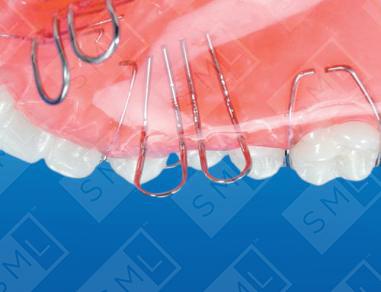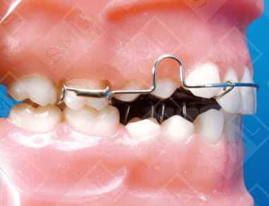 Sometimes patients develop a lateral tongue thrust. When this happens, it can inhibit the eruption of the bicuspids, cuspids, and cause an arch asymmetry to occur. To break this pattern, tongue loops are placed lingual to the premolars and cuspids in a Hawley Retainer, and the labial bow is carried all the way back to the molars. Wearing the appliance prevents the tongue from being displaced laterally during swallowing and helps to keep the patient’s cheek away as well. This permits the posterior teeth to erupt into occlusion. Bonded buttons and inter-arch elastics are often used to encourage eruption. Note: An opposing model and bite relationship are required.