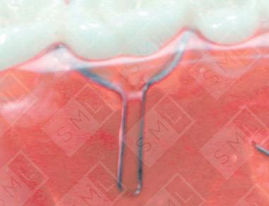 The Lingual Sage clasp is used on molars and bicuspids when they are fully erupted. It gains its retention by engaging the undercuts of the proximal surfaces and the lingual contour to the center of the tooth. Because this clasp does not have any part crossing the occlusion, it is often used in situations where the occlusion is extremely tight and any wire crossing over it would create an occlusal interference.