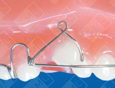 This is another design using finger springs to accomplish a variety of objectives. It is important to provide extra retention (in the form of “C” clasps soldered to the labial wire) when moving anterior teeth. To increase retention, a small composite button can be placed on the buccal -- just occlusal to the “C” clasp -- to create a retentive undercut. In situations where the mesial of the cuspid is not well exposed, the use of a bonded button or bracket will provide a positive contact point for the spring. Maximum stability is necessary to keep the appliance fully seated when activating the finger springs. Remember, it is recommended to activate no more than two springs at any one time. Activating more than two tends to compromise overall appliance retention, slowing down treatment time.