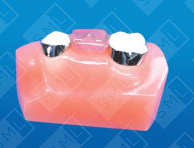 This two-band space maintainer has an acrylic pad over the edentulous region. It is designed with the occlusal surface of the pad in function with the opposing teeth and the tissue side-cleared to eliminate any interference with the normal eruption of succedaneous teeth. Before choosing this design, be sure the teeth to be banded have a parallel path of insertion. Note: This appliance can act as a food trap. This can be controlled easily with the use of an oral irrigator.