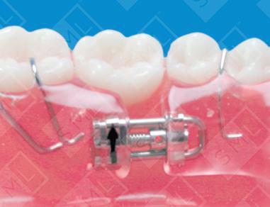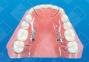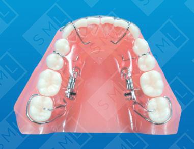 Abnormal occlusal forces, periodontal disease and poor restorative work can cause interproximal spacing to occur in the posterior segments. This often leads to food impaction that is not only annoying, but can also contribute to a worsening of the periodontal condition. This excess space can be easily reversed (shown here). Anchorage is the key to successfully closing this space. The appliance typically requires anterior retention using a combination of bilateral clasping and a labial bow Then, stainless "retraction" screws are placed bilaterally as needed to close the interproximal spaces through mesial movement of molars. Typically, heavy "C" Clasps are placed around the distal of the last molars and the acrylic is removed from the interproximal areas around the teeth needing mesial movement.