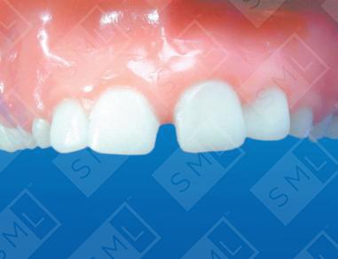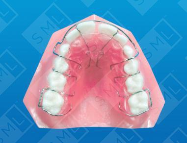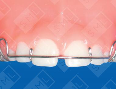 When space exists between teeth because the teeth are tipped, finger springs can be used to tip the crowns back over the roots and close the space. Shown here, the finger springs are designed to close up excess space between the centrals by tipping them mesially. Closing the diastema will create the space needed to align the laterals. The labial arch wire, Adams Clasps, and Ball Clasps provide the needed retention for this active appliance.