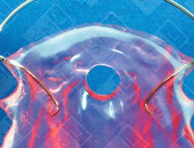 In patients exhibiting an aberrant swallowing pattern, the tongue often comes forward with tremendous force against the anteriors, causing them to move labially. The Removable Tongue Positioner -- a Hawley Retainer constructed with a 5mm hole in the acrylic at the center of the palate ( lingual to the anteriors) -- can correct this pattern. The patient is instructed to position the tip of the tongue in the 5mm hole hole during swallowing and to practice this new pattern as much as possible. Note: With all habit appliances, an opposing model and bite relationship are required.