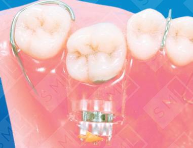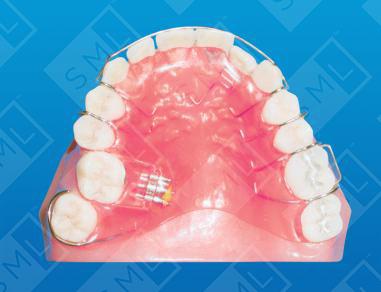 Abnormal eruption patterns can cause a single molar to end up in crossbite. Appliance selection to correct this problem is dependent upon the depth of the bite and the existence of adequate arch space to move the tooth back into position. Typically there is plenty of space to move the molar back into the arch. However, if clinical and model examination indicates a significantly deep bite and the tooth is locked lingually, a small anterior bite plane should be added to the appliance. Here a single expansion screw is used to exert pressure on the molar. With this expansion screw, you should expect to get both tipping and some bodily movement of the molar. Note: All expansion screws of this type are adjusted once a week, one-quarter turn. As with all crossbite cases, the lab must be supplied with upper and lower models and a wax bite -- this in the express interest of enabling a check for occlusal interference and assistance in selecting the right design.