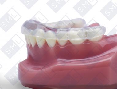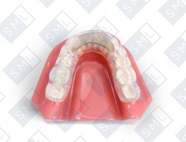 The Tanner/CR Splint is a repositioning splint that is fabricated on the mandibular arch and is used to advance the mandible. It is a full-coverage splint with acrylic that contacts the upper anterior and posterior teeth and is fabricated to the Construction Bite position as provided with the working models.