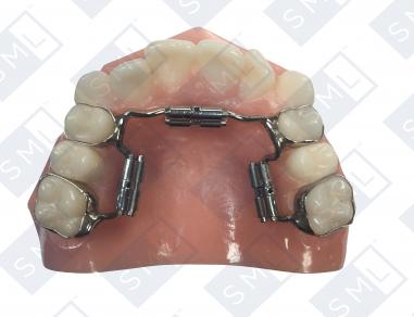 A very effective combination distal-driving, transverse development appliance. This design is typically used to regain lost cuspid space. A common cause for this type of crowding is the early loss of the primary molars. Primary molars normally serve to maintain valuable “E” space for the eruption of the bicuspids and cuspids.