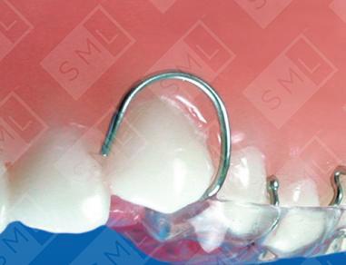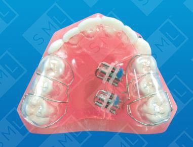 Early loss of the primary molars in an upper quadrant can lead to mesial eruption of the bicuspids and first molar. Because the anterior part of the arch is narrower, these teeth will often end up in crossbite. The mesial migration of these teeth also creates enough loss in the arch length that the cuspid either remains impacted or is forced to erupt labially from its normal position. To correct the crossbite and make room for the cuspid, the posterior segment needs to be moved distally and buccally. This Witzig Crossbite Appliance accomplishes this. In this design, the expansion screws are angled to provide a disto-buccal movement. The use of two screws is recommended to provide enough force to expedite crossbite correction. To clear the occlusion, the bite is opened with a posterior bite plane. The stationary side of the bite plane is usually ground into occlusion for extra stability while the moving side is left smooth. A cuspid retraction wire is often added to this appliance to begin guiding the cuspid back to its normal position.