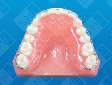 Due to the long span of labial arch wire in the “wrap-around” design, the labial wire often has a great deal of "flex." It may, as a result, come out of adjustment if the appliance is handled roughly. To help alleviate this problem -- and add stability and retention to the anteriors -- clear acrylic is processed tightly against the labial surface of the incisors. This feature adds superior retention to the overall appliance, eliminating the need for a small interproximal support wire distal to the lateral incisors (as seen in the San Antonio design).